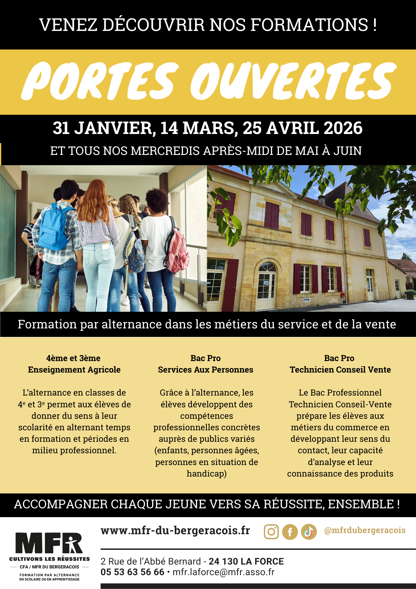 LA SAISON DES PORTES OUVERTES EST LANCÉE ! Samedi 31 Janvier de 9h00 à 13h00 Samedi 14 Mars de 9h00 à 17h00 Samedi 25 Avril de 9h00 à 13h00 Toute l’équipe est heureuse d’accueillir les familles et leurs jeunes à l’occasion de nos Portes Ouvertes 2026, pour leur faire découvrir un établissement différent, basé sur […]